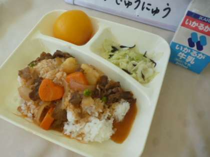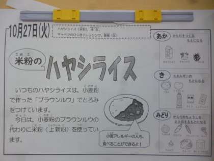 「ハヤシライス」は、小麦アレルギーの児童も食べることができるように、上新粉を使っています。今日のハヤシライスには、ラッキーにんじんが入っています!