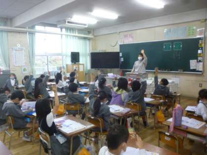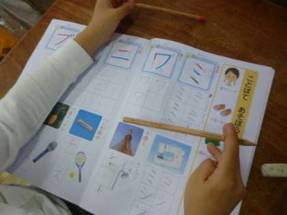 カタカナの学習をしていました。まずは、書き順を確認して、先生と一緒に空書き。その後、しっかりなぞって、お手本そっくりに練習することができました。
