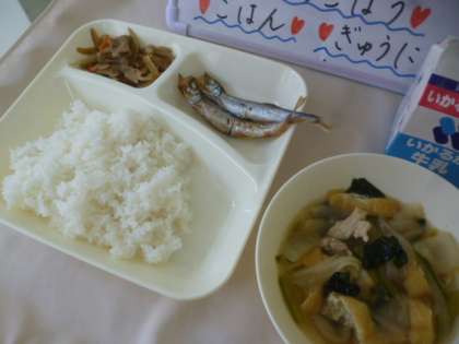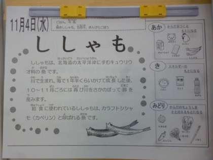 「やきししゃも」は、料理酒で下味をつけたししゃもを焼き物機で焼きます。網を敷いたホテルパンを使用することで、下側への熱のまわりもよく、仕上がります。1人当たり2尾ずつになります。骨までもすべて食べることができます。