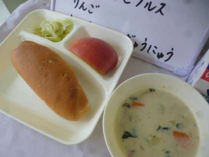 「きのこのクリームシチュー」は、エリンギ、しめじ、マッシュルームのきのこ類、青みにほうれん草を使用しています。ホワイトルウは、小麦粉と綿実油で作り、コクを出すためにクリームを加えています。