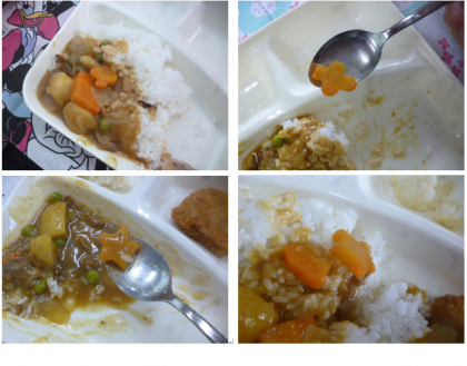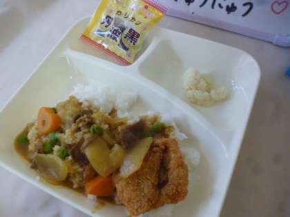 「カツカレーライス」は、牛肉を主材としたカレーライスに一口とんかつをそえます。今日はラッキーにんじんDAYでした!!