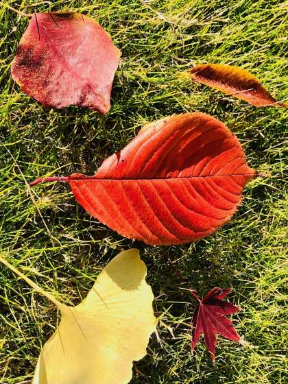 自然園でいろいろな形の落ち葉を集めて芝生の上に並べてみましたみました。