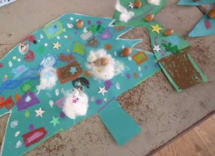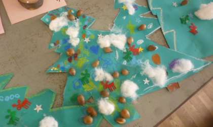 クレパスで下描きをしたクリスマスツリーに、どんぐりやビーズで飾りをつけました。自分だけのクリスマスツリーが完成しました。どのツリーもとてもかわいく仕上がっています!