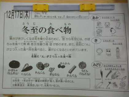 今年は12月21日が冬至です。給食では今日、かぼちゃを食べました。冬至にかぼちゃを食べると、風邪をひかず健康に暮らせると言われています。
