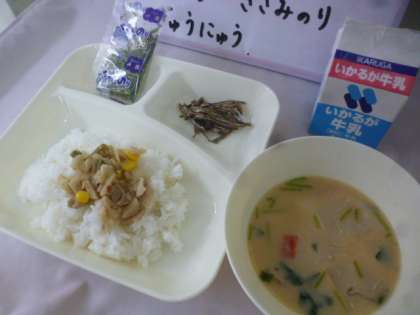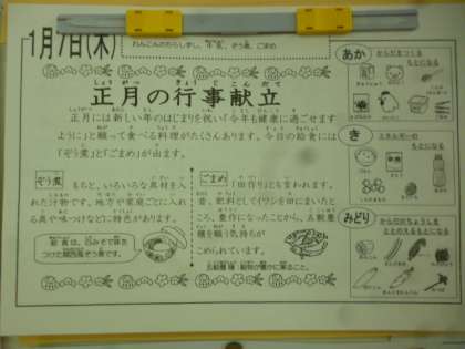 正月には、新しい年のはじまりを祝い「今年も健康に過ごせますように」と願って食べる料理がたくさんあります。今日の給食には「ぞう煮」と「ごまめ」がでました。