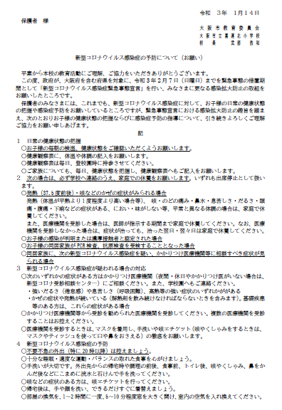 この度、政府が、大阪府を含む府県を対象に、令和3年2月7日(日曜日)までを緊急事態の措置期間として「新型コロナウイルス感染症緊急事態宣言」を行い、みなさまに更なる感染拡大防止の取組をお願いしたところです。それに伴うお願いの文書を、本日児童へ配布しておりますのでご確認よろしくお願いします。