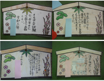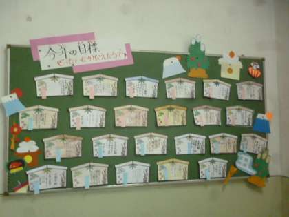 5年生の学年掲示板です。今年の目標を「絵馬」に書きました。それぞれ自分の目標にむかって努力し続けてもらえればと思います。素敵な目標をいくつか紹介します!
