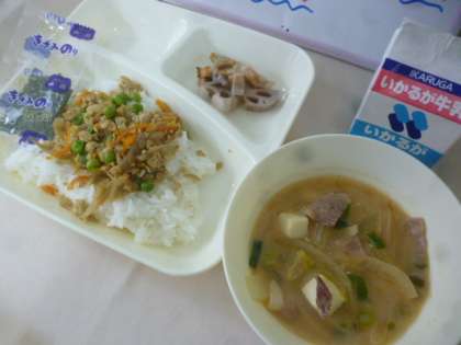 「鶏ごぼうご飯」は、しょうがで下味をつけた鶏ひき肉、つきこんにゃく、ごぼう、にんじん、グリンピースが入ったまぜごはんです。