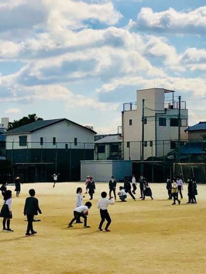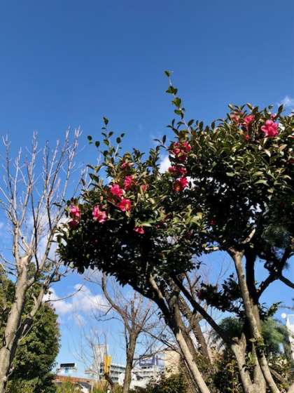 少し寒いですが、みんな運動場に出て元気に遊んでいます。自然園で珍しい山茶花の花を見つけました。3メートル以上の高いところに花が咲いています。冬の青空に映えています。