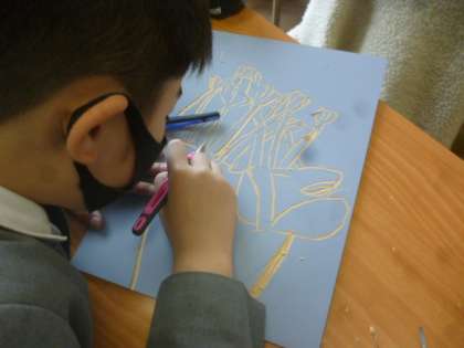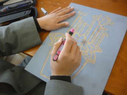 5年生、図画工作科の学習の様子です。彫刻刀の使い方に気を付けながら、丁寧に彫り進めています。多色刷りする予定です。完成が楽しみです!
