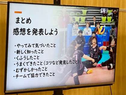 パラリンピック競技シッティンクバレーボールに挑戦しました。3年生は総合的な学習の時間で「ユニバーサルデザインのまちづくり」について学習しています。前回の車いす体験学習に続いて、今日はパラリンピックスポーツ・シッティングバレーボールについて学習しました。