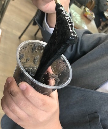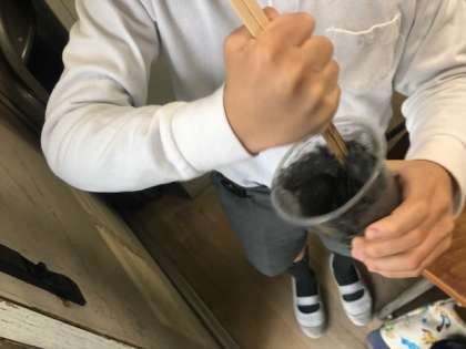 先日集めた砂鉄の入ったスライムをつくりました。砂鉄が入っているので磁石にも反応します。子どもたちは割りばしで一生懸命混ぜて完成したスライムを見て喜んでいました。