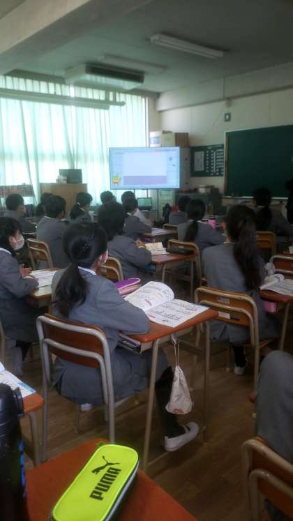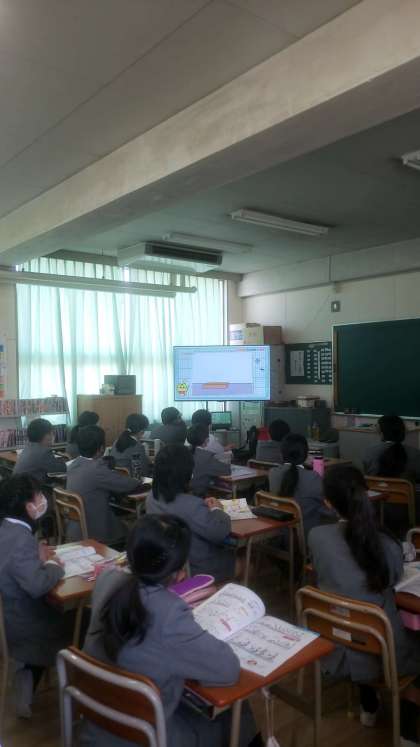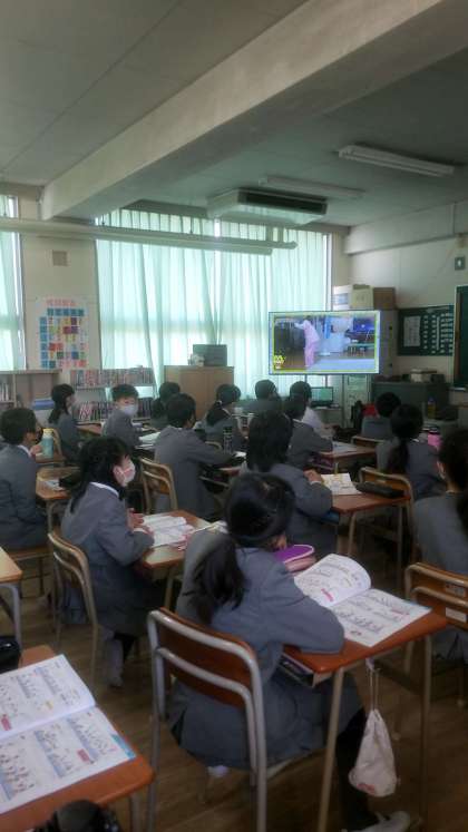 今日の体育は、教室で行っています。マット運動の前転や後転などのポイントを動画を視聴しながら学習しました。