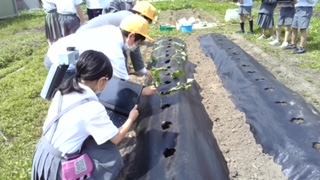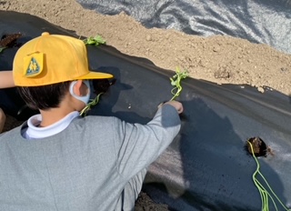 サツマイモを植えました。苗を植える子とその様子をタブレットで撮影する子に分かれ、みんなで丁寧に植えることができました。タブレットも上手に使いこなしています。水やりを毎日して、秋に収穫できるのが楽しみですね!