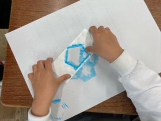 画用紙を色んな形にくり抜き、周りをクレパスでなぞり、指でこすって模様を作りました。