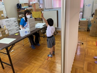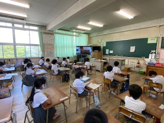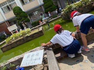 休み時間には、中庭で朝顔のみずやりや管理作業員さんから鯉のえさをもらって鯉の観察もしています。喜連北小学校の中庭は本当に素敵な場所でみんな大好きです。