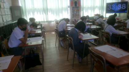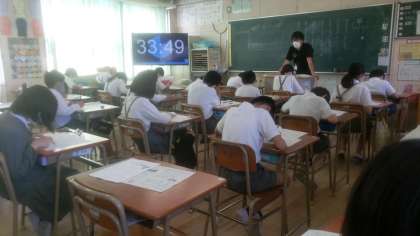 今日5、6年生が取り組んだ教科横断的な問題は、 複数の文書や資料から情報を読み取ったり、問いに対して判断 の根拠や理由を明確にして自身の考えを表現したりする力を問う問題です。じっくり落ち着いて問題に取り組みましょう。