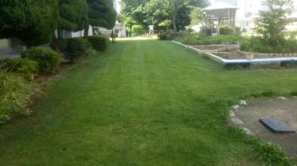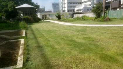週末に、地域の芝生委員会の皆さんに手入れをしていただきました。早速、ごろんと気持ち良く寝転がる子供たちの姿が見られました。