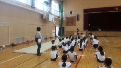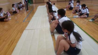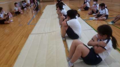 講堂でスポーツテストをしています。普段であれば二人組になっての測定ですが、感染予防の為に一人で上体お越しをしています。少しやりにくそうでしたが、みんな頑張って取り組んでいました。