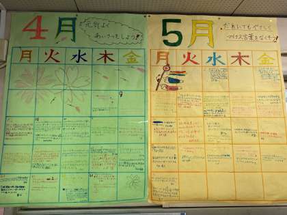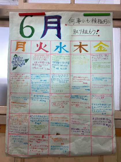 1学期も残すところ3週間余りとなりました。子どもたちは毎日の出来事をカレンダーに書いてます。4月から書き始めて、もう明日から4枚目になります。時間が過ぎるのは早いものです。7月からもいろんな出来事をカレンダーに書き溜めていこう!