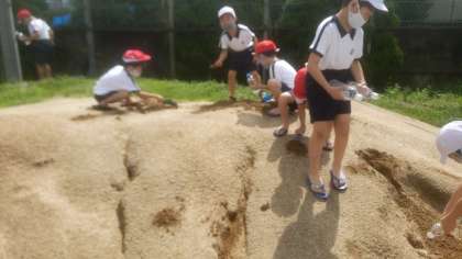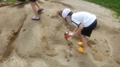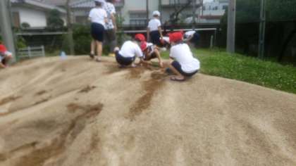 運動場の隅にある砂山を使って水遊びをしました。川を作ったりトンネルを作ったりする中で、色んな気づきがあったようです。