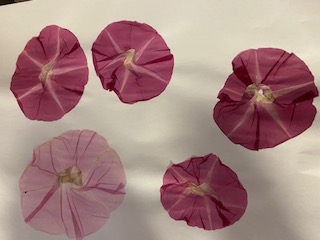 1年生のみなさんにプレゼントしたいなと思い、朝顔の押し花(おしばな)をつくっている途中です。人数分の花が咲きますように・・・