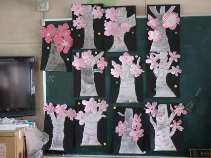 4月15日(水)、いつもあちらこちらおじゃましています。6限目、2年生2組では、学級のテーマをみんなで真剣に考えていました。と、ふと教室移動で留守にしていた4年生1組の黒板には、とってもきれいにサクラがいっぱい咲いていました。