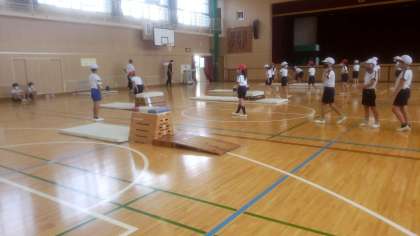 「かかえこみ跳び」の学習です。膝をしっかりと胸につけることがポイントです。