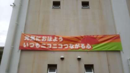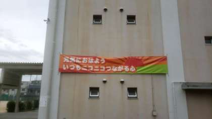 「元気におはよう いつもニコニコつながる心」は、1学期に子供たちから募集し、子供たちの投票により決まった標語です。ようやく横断幕が完成し、さっそく正門前に掲示しました。