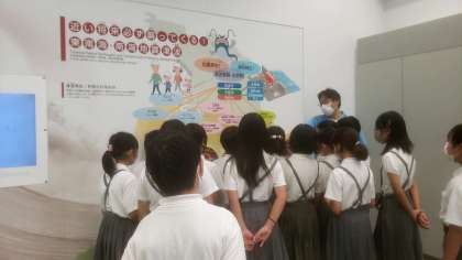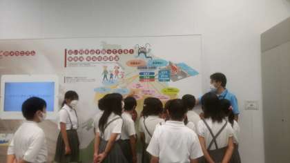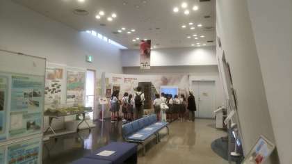 津波の恐ろしさについてパネルを使って説明を受けています。