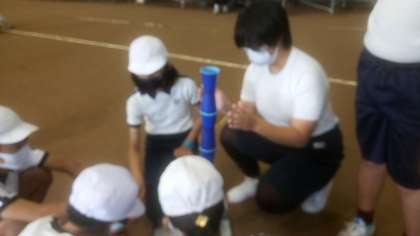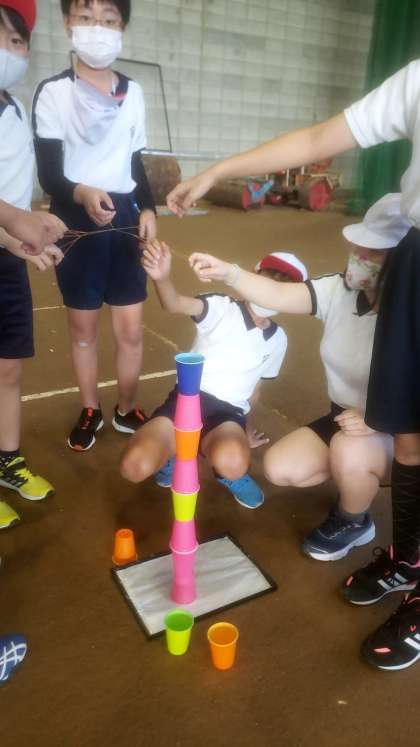 カップタワーゲーム。輪ゴムを使ってみんなでカップを積み上げます。