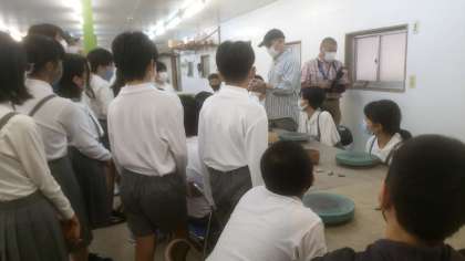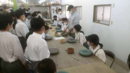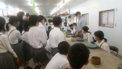 焼き物教室の講師の先生から作り方の説明を受けています。