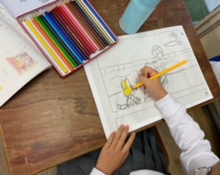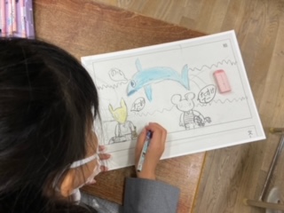 「絵を見てお話を作ろう」で4コマのうち抜けている1コマを自分で考えて物語を完成させます。