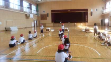 2組は講堂で跳び箱の学習です。安全に跳ぶための約束を確認してから、活動に入りました。