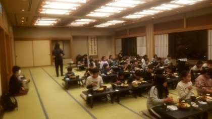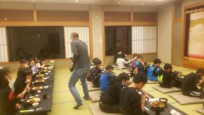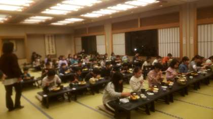 夕食の様子です。感染対策の為、前を向いて、静かにいただきます。