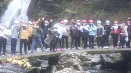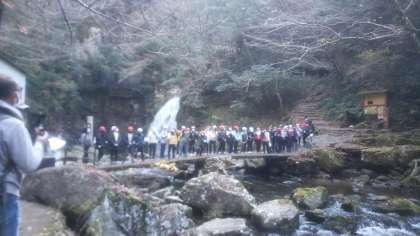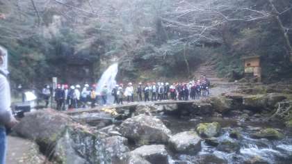 滝をバックに集合写真です。いい感じの写真が撮れました。
