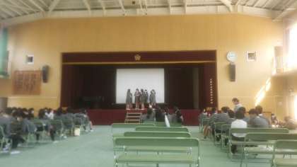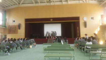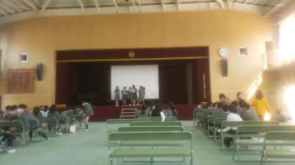 講堂で茶話会を行いました。グループに分かれて、それぞれのグループで出し物を披露しました。スペシャルとして、担任の先生方による漫才も行われました。