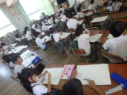 6月4日(木)、喜連北小学校では、昨年度から子どもたちの学力育成の一環として、国語科で『確かな読みの力を育てる指導法の工夫』を研究主題として取り組んでいます。下の写真は、その一手法としての「一人学びの充実」を図る取組みの場面で、子どもたちは、教科書をコピーした用紙に、どんどん自分の思っていることを書き込んでいます。「先生、ボクは54個書いたでー」という子もいました。自分の思いを記入する鍛錬により、読みが深まり、コミュニケーションの基礎である自分や人の思いがよりスムーに表現されたり理解されるようになります。