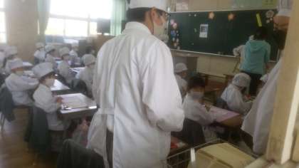 1年生の皆さん、しばらくは、6年生のお兄さんやお姉さんが給食の準備をしてくれます。その様子をしっかりと見て、準備の仕方を覚えてくださいね。
