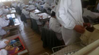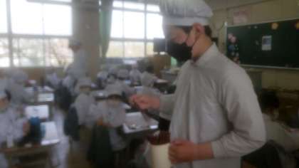 6年生の皆さんが1年生の給食準備をしてくれています。手際の良さに1年生も驚いていました。