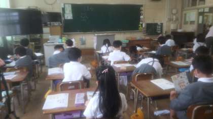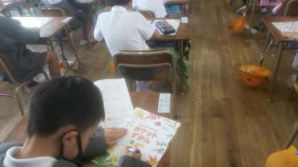教科書を使って春の植物について調べています。学校の自然園や中庭にもあるかな?