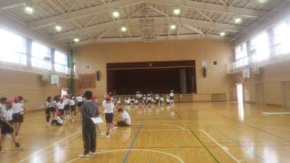 講堂でスポーツテストを行っていました。手前は反復横飛び奥では上体反らし?