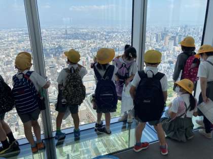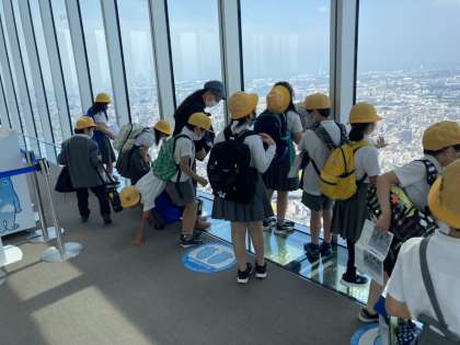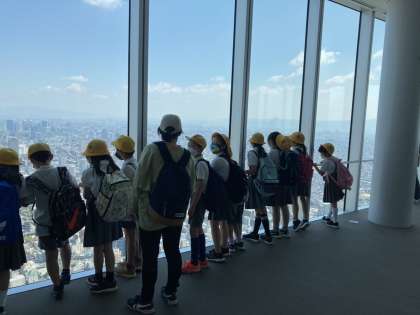私たちが暮らす大阪市を概観するために、あべのハルカスに行きました。自分たちが住んでいる町と比べてみると、それぞれの区の特色がつかみやすいですね。