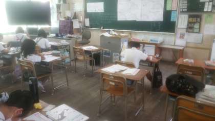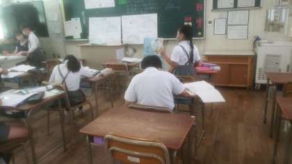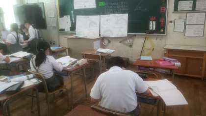 分度器を使って三角形をかいたり、指定された角度で直線を引いたりする学習です。分度器を正確に上手に使って問題を解いていました。