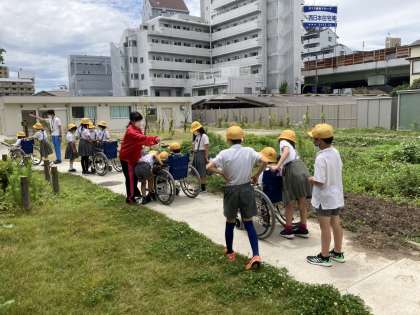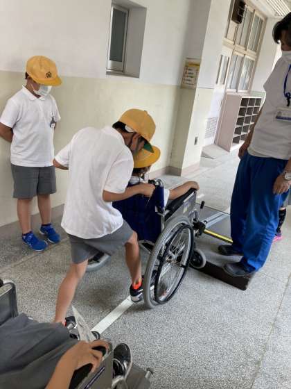 心身障がい者リハビリテーションセンターの職員の皆様にご来校頂き,車いすに乗ったり、押したりする体験学習をしました。