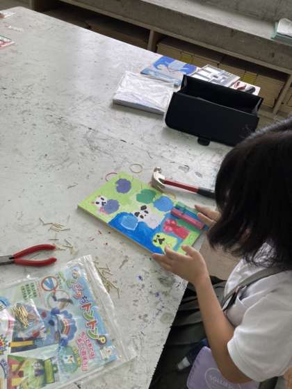 金槌とくぎを使ってコリントゲームを製作中です。最近は、お家でくぎを打つという体験も少なくなっているので、子ども達は悪戦苦闘していましたが、安全に気を付けて慎重に活動を進めていました。