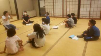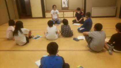 キャンプファイヤーが終了し、部屋に戻って来ました。部屋長会議をしています。しっかりと、話を聞いて部屋の人に伝えましょう。