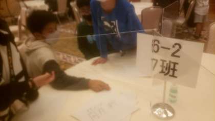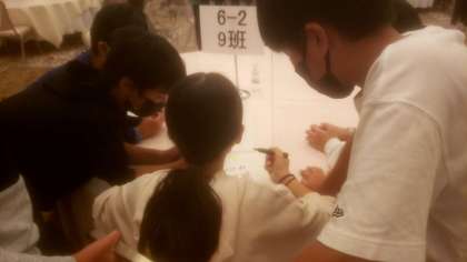 食事の後、レクリエーション。まずは、班対抗ゲーム。担任の先生方の名前フルネームを漢字で書きます。これが以外と難しいようで、どの班も悪戦苦闘しています。