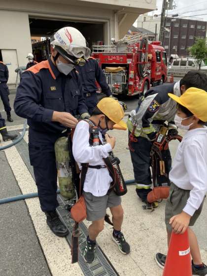 消火活動の時に用いる装備を持たせて頂きました。「おっ、重い!」