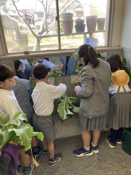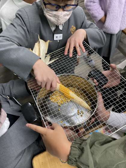 水はとても冷たいですが、みんなで協力して一生懸命、大根を洗っています。トウモロコシは管理作業員さんから頂きました。ポップコーンにして食べるそうです。